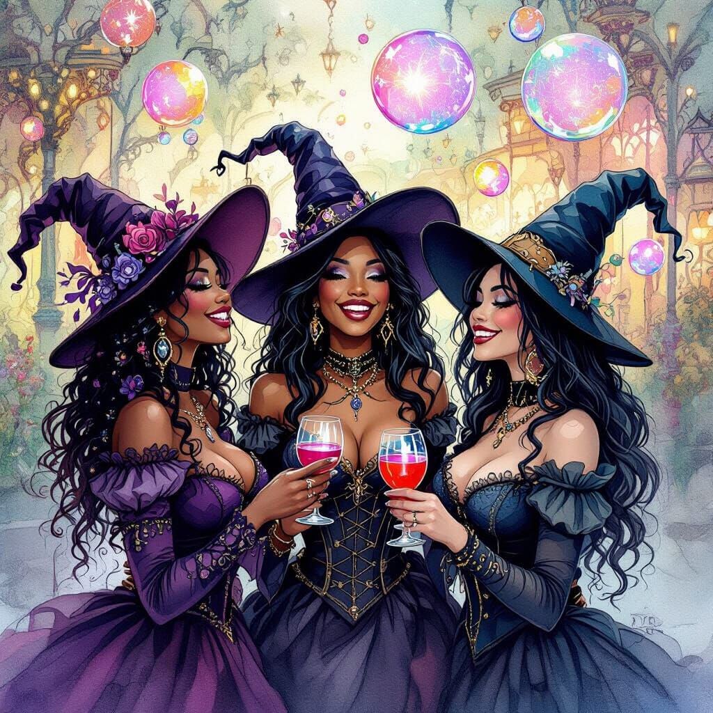 Intricately detailed alcohol ink illustration, tivoli fun park, a group of well-dressed dark-skinned Goth Witches of differing ethnicities are having fun, Zentangle, fantasy illustration, detailed painting, and vibrant color floating luminescent bubbles