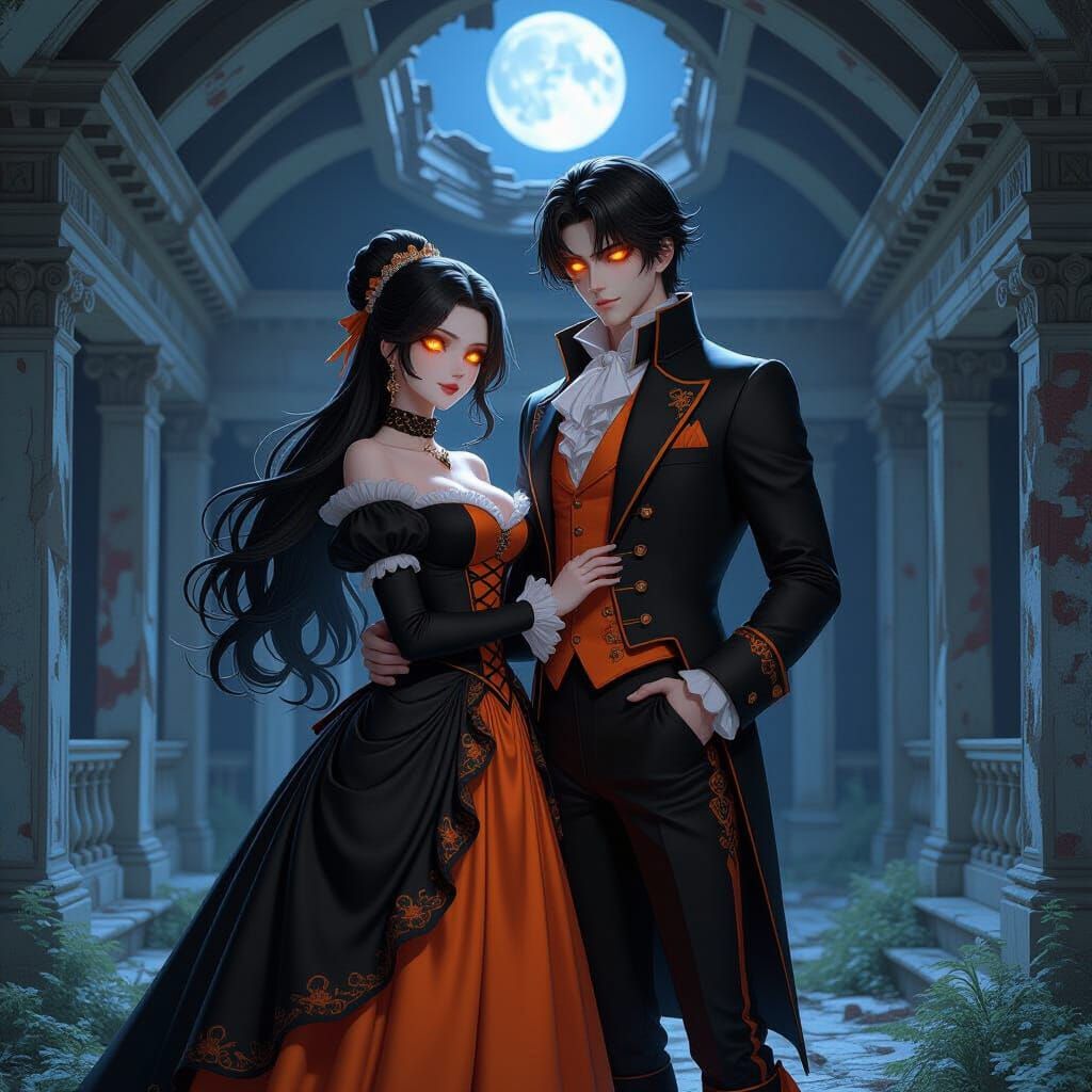 A couple in Regency attire with striking black eyes stand within a decaying mansion at night. Moonlight illuminates the scene, creating a dramatic and atmospheric effect.