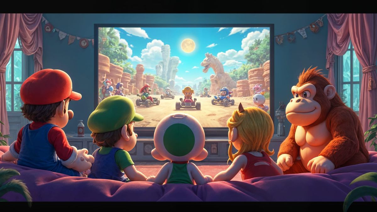 This image shows Nintendo characters enjoying Mario Kart on a big screen in a vibrant, fantastical setting. The digital artwork features deep colors and intricate details, reminiscent of fantasy concept art rendered in Unreal Engine 5.