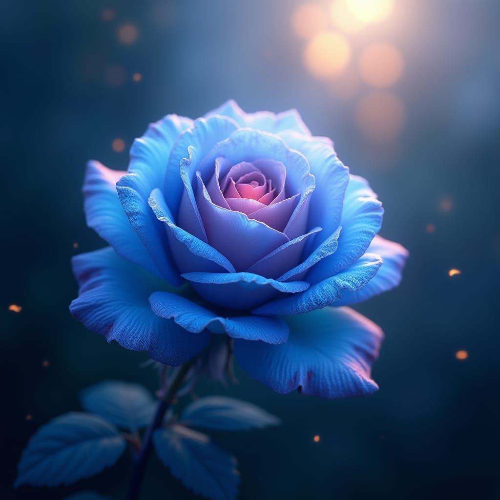 This stunning, high-tech image showcases a vibrant, iridescent blue rose blooming in mid-air, surrounded by a halo of soft light and a misty, dark background. Rich, polychromatic colors and intricate details evoke a sense of fantasy and wonder, blending traditional media with sleek, futuristic aesthetics...