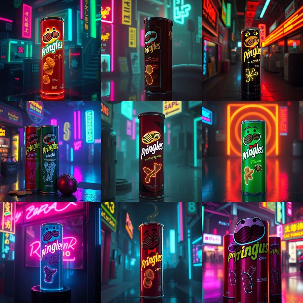 This image shows Pringles in a futuristic cyberpunk aesthetic. The neon-lit scene evokes a Blade Runner 2049 style, creating a vibrant and dystopian atmosphere.