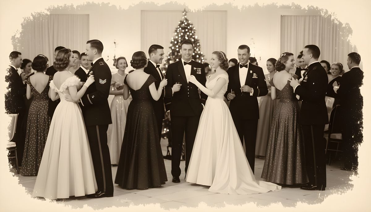 This image shows an elegant Christmas ball in 1942 during World War II. Army Air Force officers mingle with women in gowns, capturing a nostalgic Americana aesthetic in sepia tones.