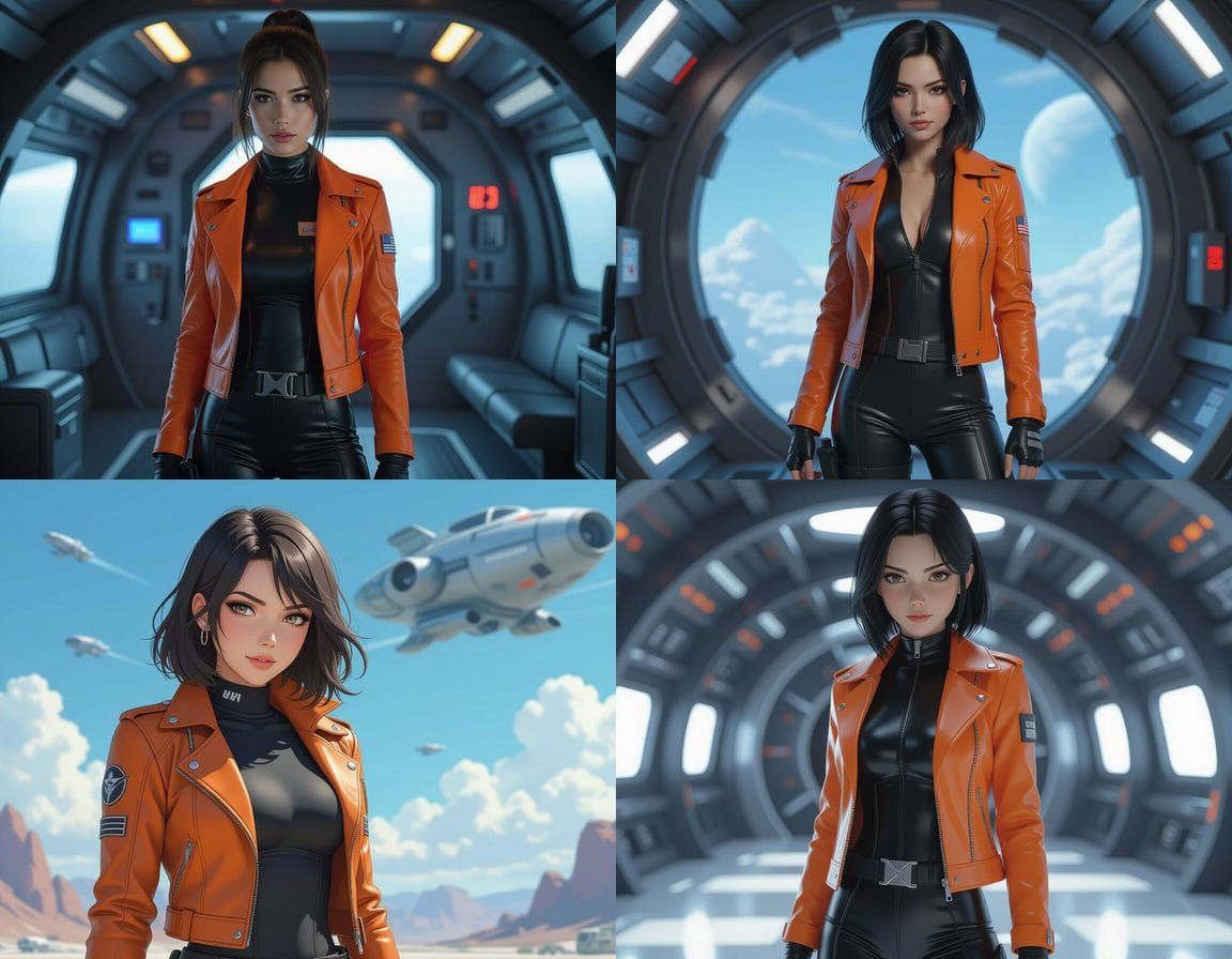 A young woman around 25 years old. Slim and athletic, she wears a tight black synthetic jumpsuit and an open orange leather jacket. By artist "anime", 3d anime art, inspired by WLOP, Artstation, #genshinimpact pixiv, extremely detailed, aesthetic, concept art, ultrafine detail, breathtaking, 8k resolution, ...