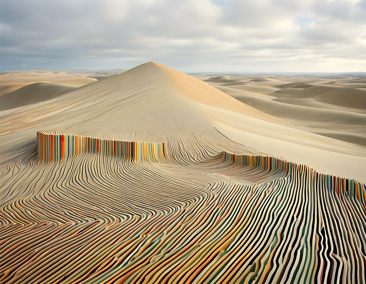 This image features a colorful and geometric representation of striped sand dunes, blending the natural and the abstract