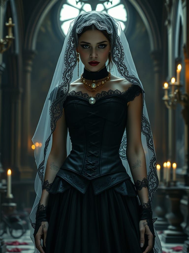 A striking picture of a vampire in a black corset gown with a lace veil. The image features glowing eyes, pearl tears, and golden jewelry, set in a candlelit, decaying palace, in a dark, mystical, romantic style.
