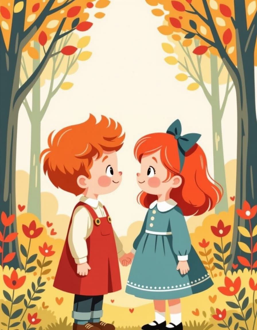This whimsical illustration features a red-haired boy and girl in a playful, storybook style. It uses detailed linework and soft, muted colors with warm highlights.
