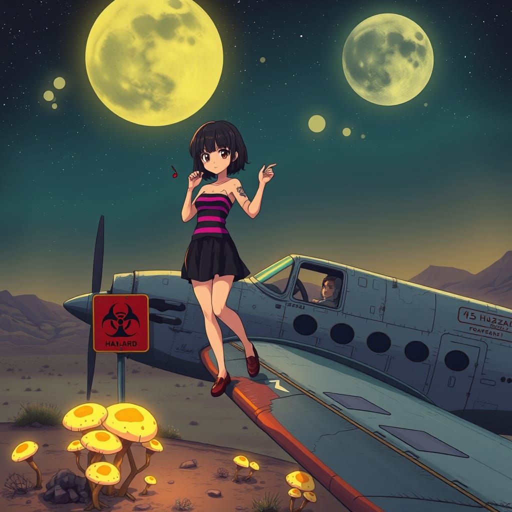 This image shows a vibrant anime-style girl with short black hair dancing on an airplane wing in the desert. The scene, rendered in a cel-shaded style, features glowing mushrooms and a gasoline-colored sky.