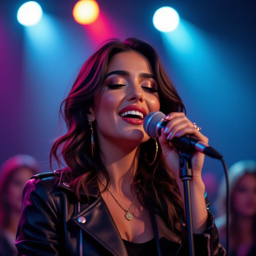 A hyper-realistic mid-shot portrait of Israeli singer Odia Azulay performing passionately on stage, holding a microphone. Cinematic lighting and vibrant colors create an emotional atmosphere.