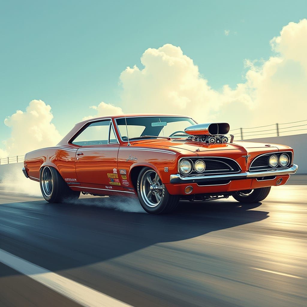 This image shows a classic 1960s muscle car gleaming with chrome details and racing decals, staged at the starting line of a sunlit drag race track in a retro-futuristic style.
