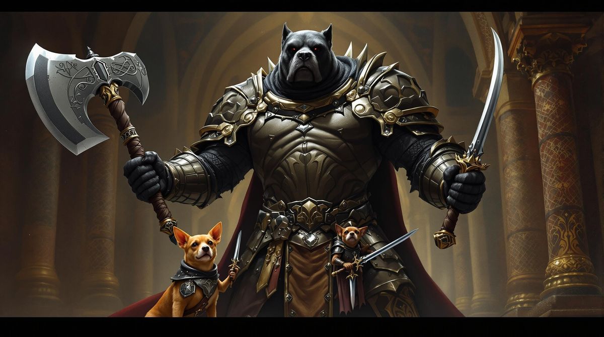 This image showcases three humanoid dogs proudly standing in a heroic pose, each clad in intricately crafted fantasy leather armor. A massive black mastiff wields an axe, while a golden labrador retriever juggles sabers and a tiny chihuahua grasps a dagger, set against a rich medieval-inspired backdrop w...