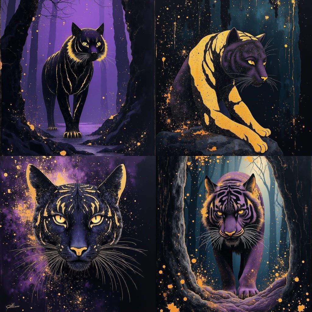 Generate your own mystical deep dark purple tigers with gold yellow stripes. Free and easy to use AI image creator.