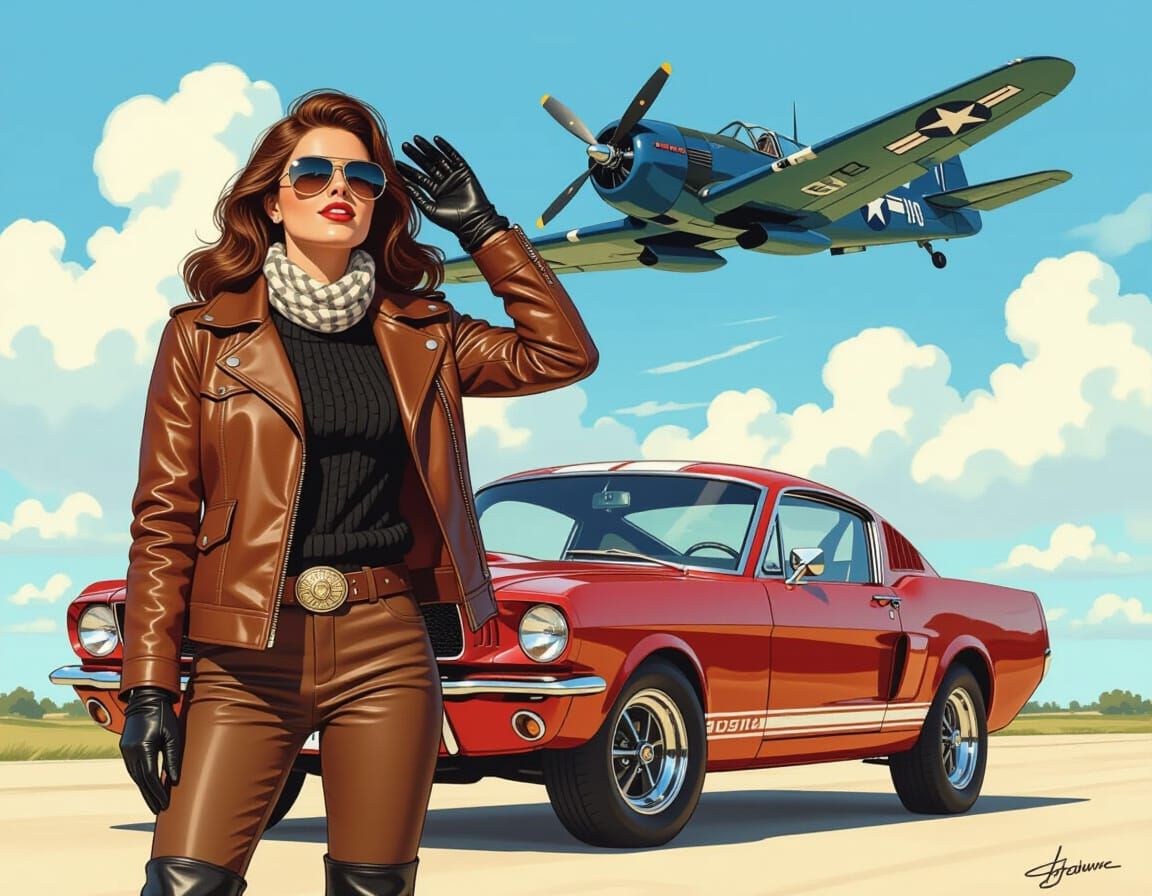 This image shows a brunette pilot in aviator attire waving at a vintage Corsair flying overhead. The scene is set against a 1967 Shelby GT350, rendered in a bronze-age comic style.