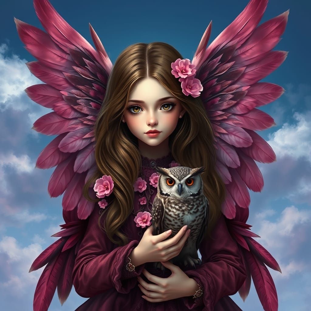 This image shows a beautiful woman with owl wings holding a small owl. She wears an elegant burgundy dress and is decorated with pink flowers, set against a cloudy blue sky in a digital art painting style.