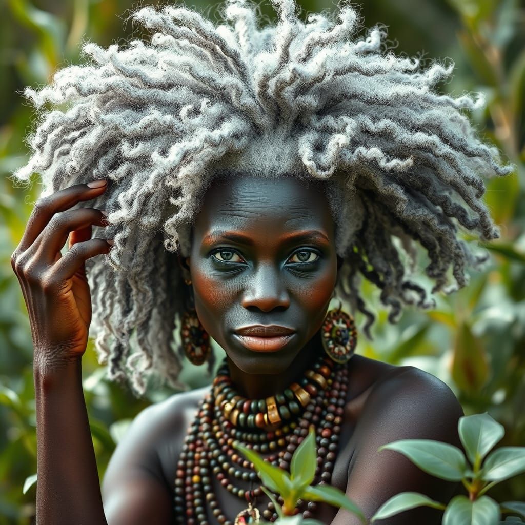 This image shows a striking black woman with wild, silver hair, in traditional African tribal dress. It evokes a mystical, dreamlike quality through surreal elements and lush, green surroundings, with the feel of African folk art.