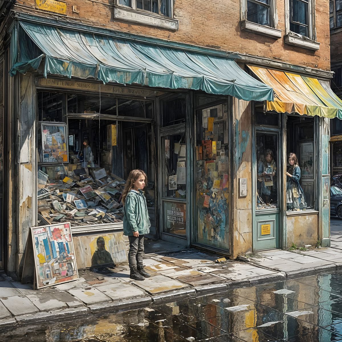 This image depicts a little girl by a storefront, her reflection showing a post-apocalyptic landscape. Created with thick, grungy brushstrokes and gouache, it features a vintage, glitchcore aesthetic.