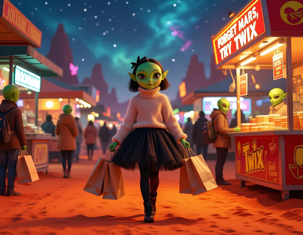 This image depicts a young green alien girl with shopping bags at a bustling night market on Mars. Orange sand and a nebula sky create a cinematic, sci-fi scene with other green aliens.