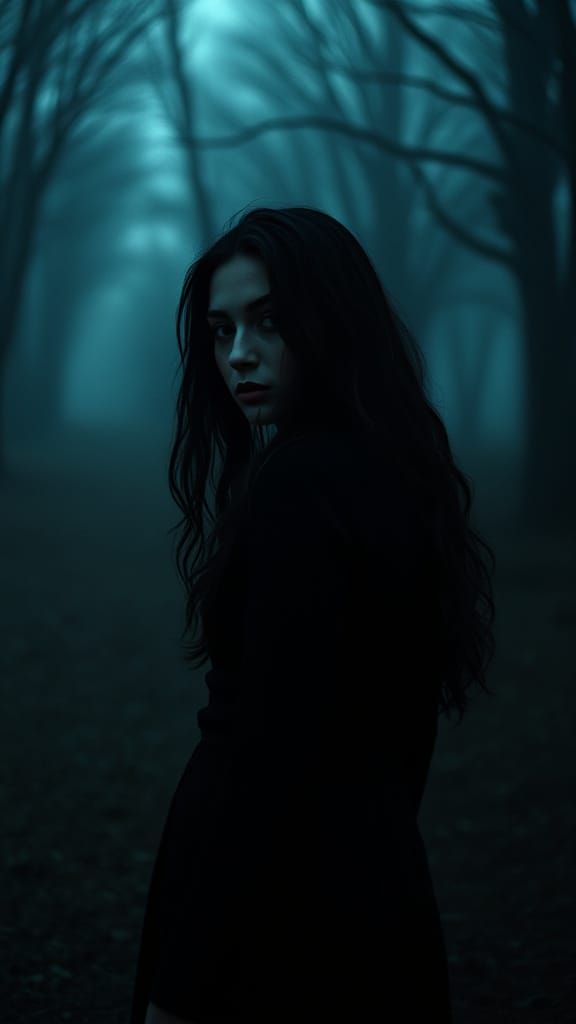 This image is a dramatic film still of a woman in black, captured in a cinematic style with film grain and vignette, evoking a sense of mystery and atmosphere.