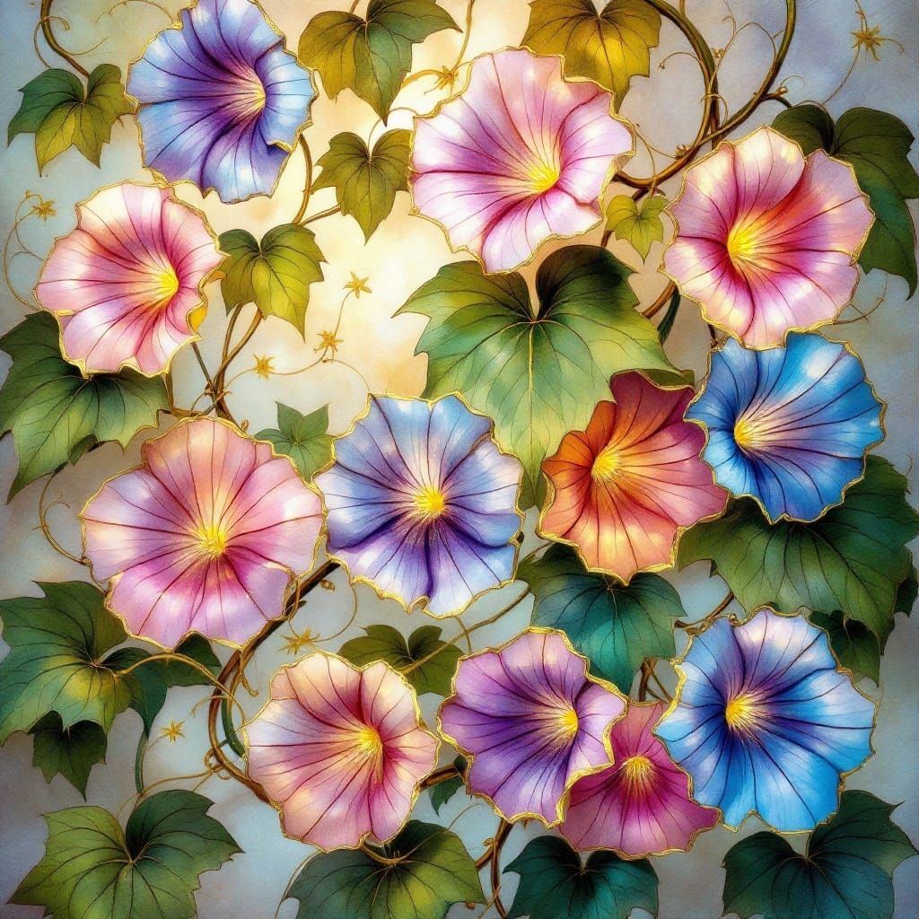 This image showcases a lush morning glory vine with intricately entwined stems and vibrant blooms, set against a backdrop of heavy gold filigree and soft, warm light, blending Art Nouveau and Symbolist styles with elegance and sophistication.