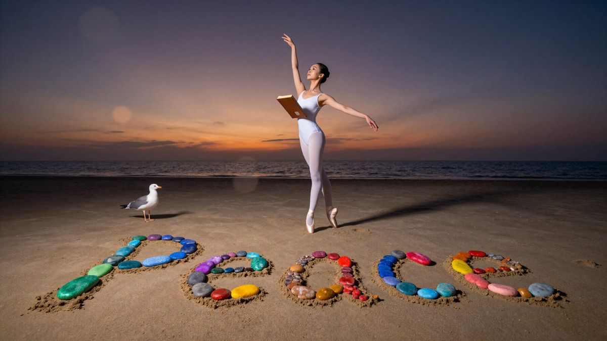 This photorealistic image shows an Asian ballet dancer on a beach at sunset, writing 'Peace' in the sand with colorful stones. Cinematic lighting and a wide-angle view enhance the scene.