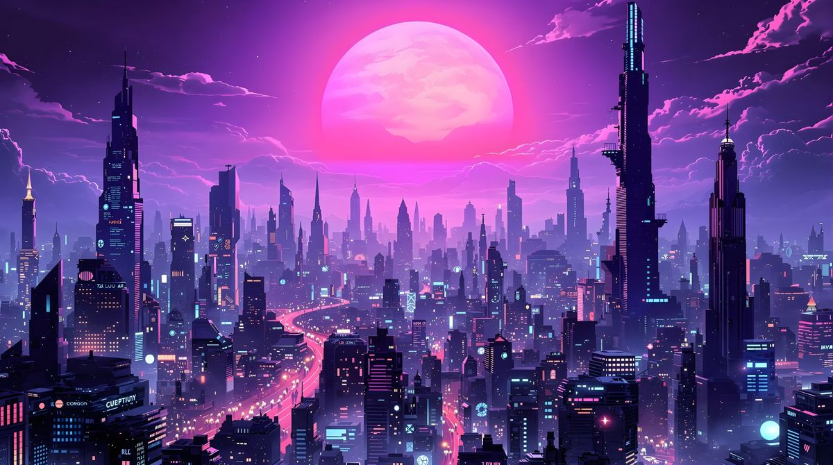 This image shows a vibrant cityscape bathed in purple light beneath a purple sun. The skyline is a striking silhouette against the colorful sky.
