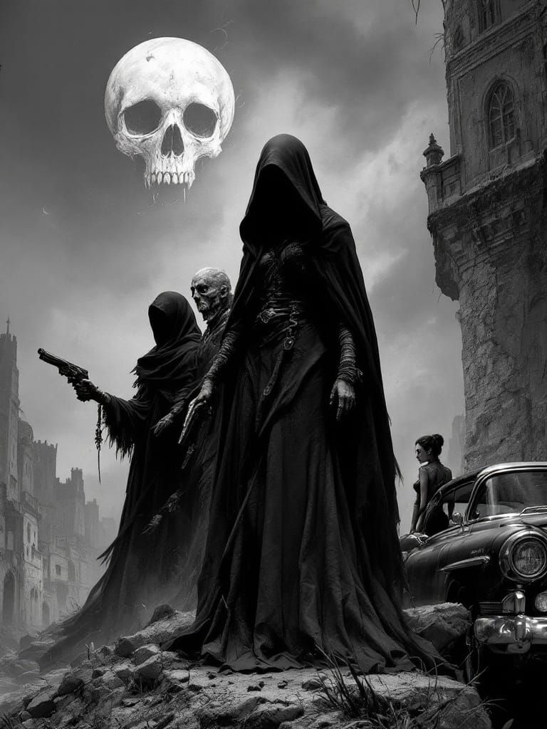 This haunting image depicts three crone-like witches standing beneath a skull-faced moon, surrounded by a battle-scarred woman and a glamorous assassin. The setting is a ruined gothic fortress, under a stormy black-and-white sky. The artwork combines elements of gothic horror, noir, and mythic realism, e...