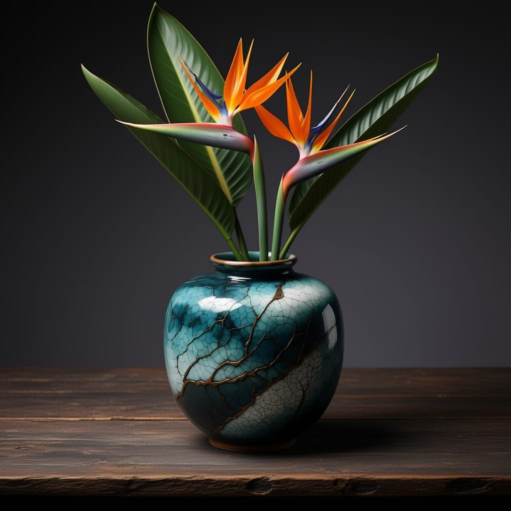This image features a single Raku ceramic vase holding vibrant orange Strelitzia flowers and green leaves, placed on a dark, textured wood table.