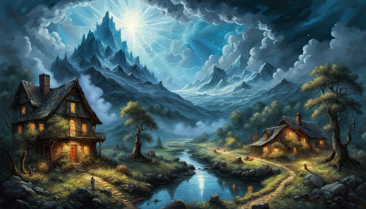 This image shows a quaint Umgebindehaus beside a stream, featuring a stone path, shrubs, butterflies, and birch trees. The scene, set against hills and an oak forest, blends sunshine with dark clouds in a detailed, ethereal style.