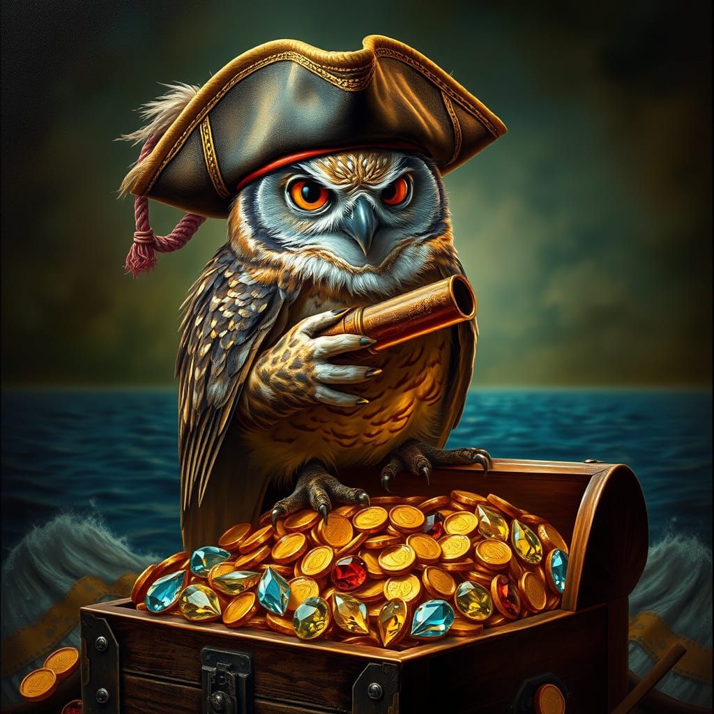 A photorealistic image shows an owl dressed as a pirate sitting on a treasure chest. The owl has a spyglass and pirate hat, rendered with dramatic lighting to create mystery and intrigue.