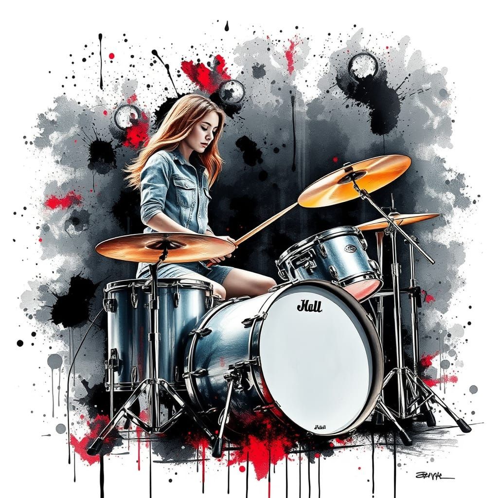 Color Ink Splatter Art ink splatter, ink splash, ink drops, ink drips, stage background. woman wearing denim playing a silver drum kit, ink splatter by 88 Jeremy Mann, Pino Daeni, Alphonse Mucha and Alex Maleev and Liz Gael, ink splash, Ink Drip, a masterpiece, 8k resolution, trending on artstation, ...