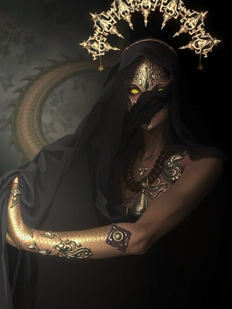 This image shows a death priestess in a black robe with golden embroidery and a veil. Dragon scales glisten on her skin, and her eyes glow with a mystical aura in a dark fantasy style.