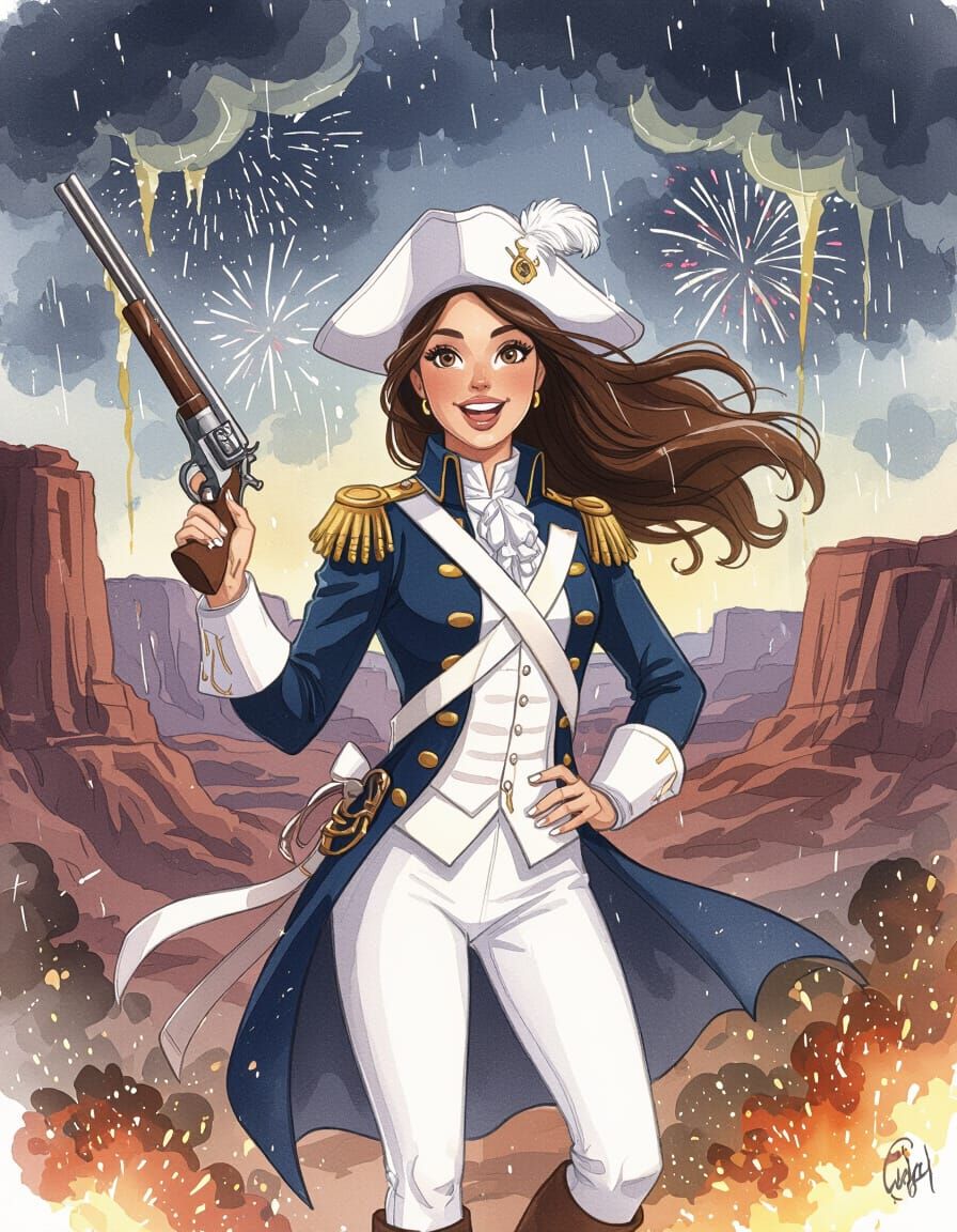 A happy woman in a 1700s military uniform and hat, holding a shotgun, set against a dark, acid-raining canyon with explosions and fireworks, rendered in a soft watercolor style.