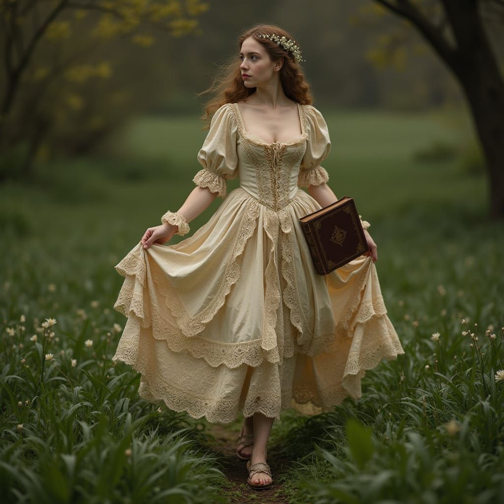 This image shows a young woman in 18th-century clothing walking through lush spring grass with a book. The artwork evokes the style of rococo paintings with hyperrealistic rendering and cinematic lighting.