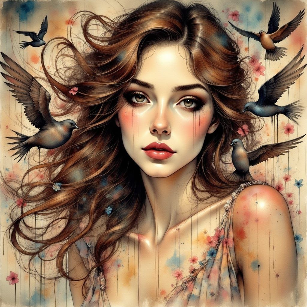 This image shows a woman with flowing brown hair surrounded by swallows, rendered in a watercolor Art Deco style. The artwork evokes dark romanticism with whimsical, elegant fantasy elements.