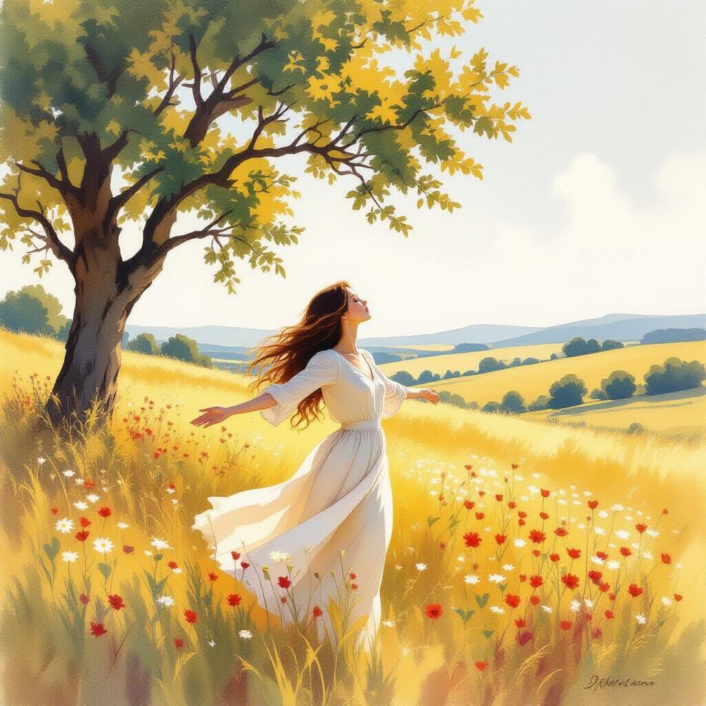 This image shows a tranquil watercolor painting of a woman in a sunlit field. The impressionistic style features soft edges and blended colors, evoking a dreamlike atmosphere.