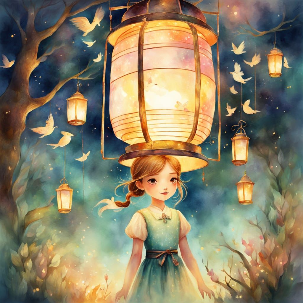 This image shows a girl inside a lantern, surrounded by a whimsical fantasy world. The artwork employs a soft, dreamy watercolor style with gentle brushstrokes and a warm, vibrant pastel color palette.