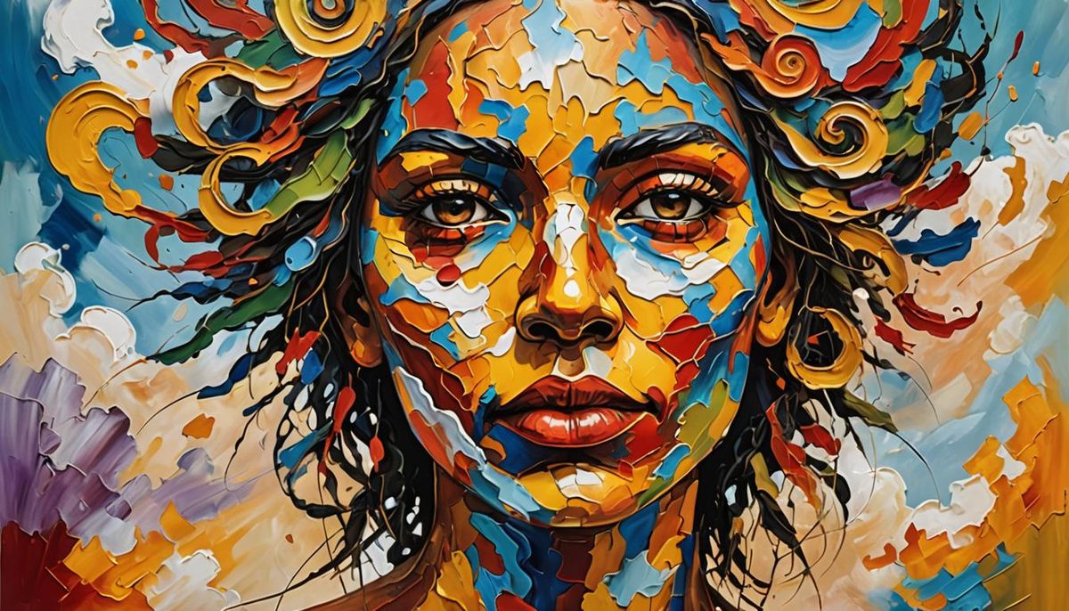 This image showcases an abstract face formed from nature and clouds, rendered in a vibrant Aboriginal oil painting style with thick, expressive impasto brushstrokes and warm golden light.