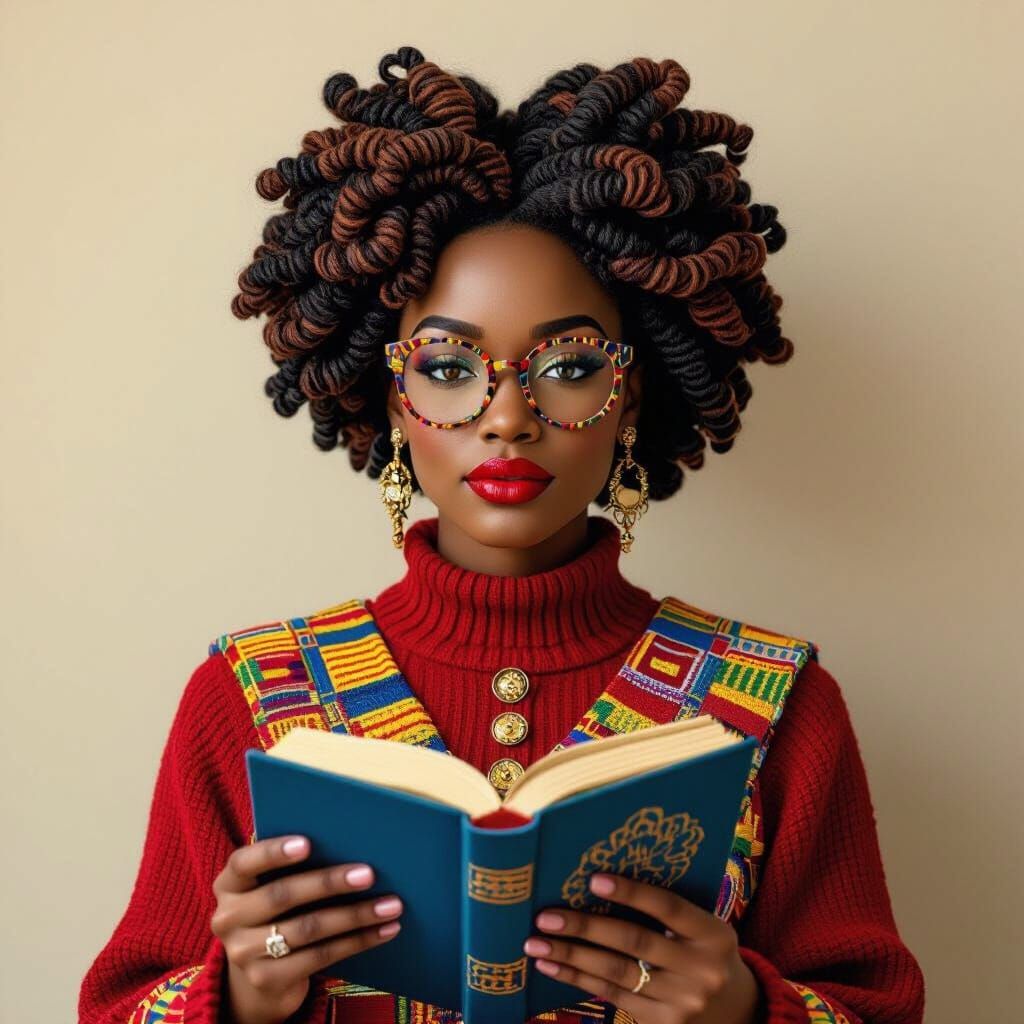 This image showcases a detailed textile portrait of an African American woman reading. Created with yarn and thread, it features a kente dress and intricate stitching, evoking a warm, contemplative mood.