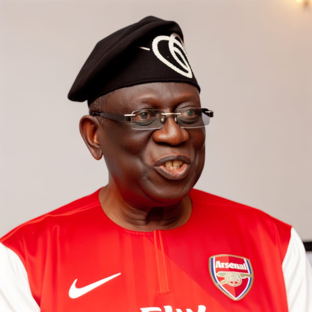 This image shows a dignified politician of Yoruba heritage sporting an Arsenal jersey with the number 10, blending politics and football in a unique style.