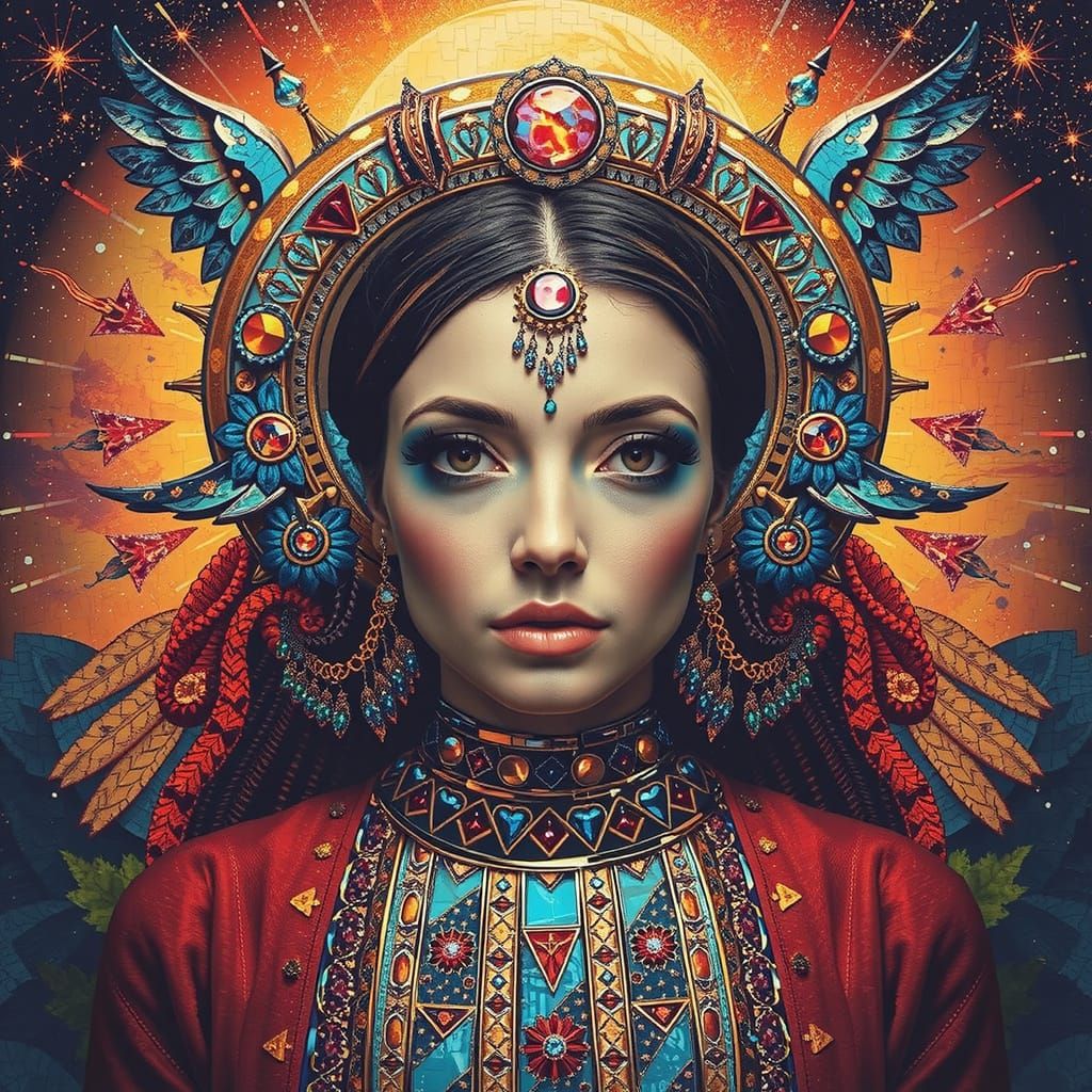 A mosaic artwork of a woman with iridescent colors rippling across her skin, set against a deep starry night. The image is rendered in a maximalist style with intricate detail.