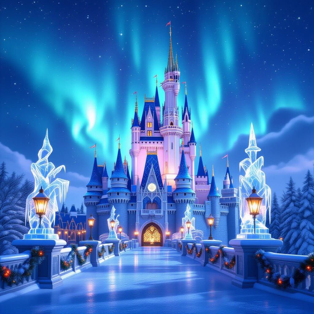 This image showcases a majestic winter castle adorned for Christmas, illuminated by the aurora borealis and sparkling icicles. Rendered in a digital matte painting style, it evokes an enchanted fantasy world with cool colors and celestial lighting.