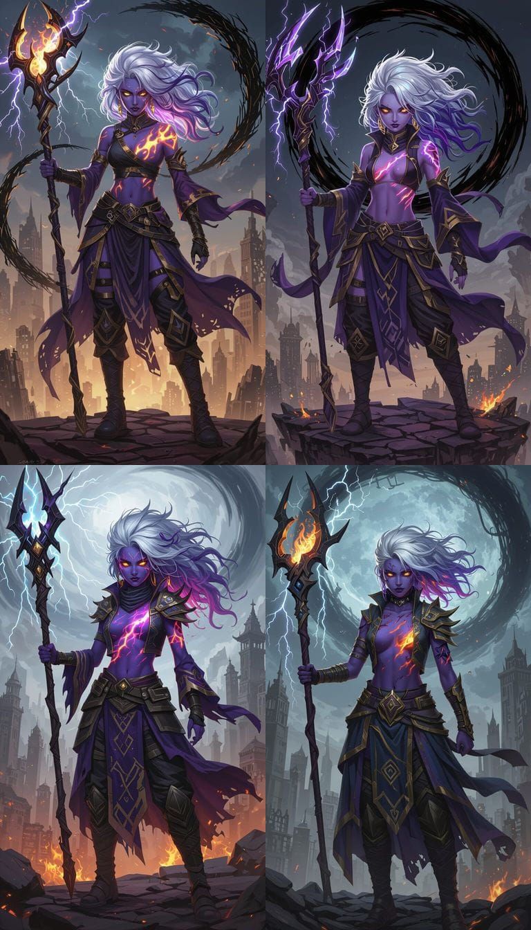 This image shows a formidable young woman with glowing purple skin and wild silver-blue hair, wielding a staff amidst a crumbling metropolis. Features cinematic lighting and an anime-surrealism style.