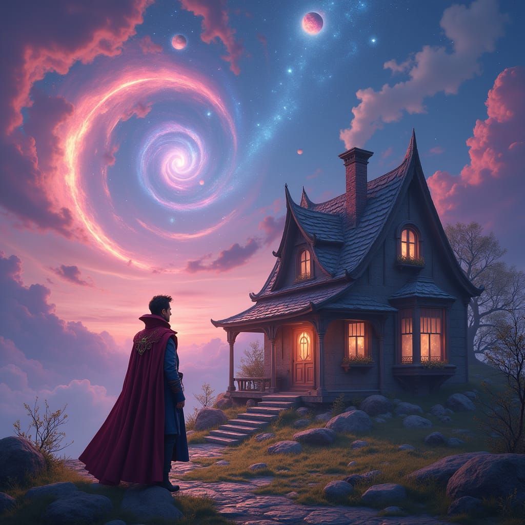 This enchanting image depicts a magical scene of a glowing cottage surrounded by vibrant, iridescent skies and multiple planets, blending fantasy and photorealism with intricate details and textures.