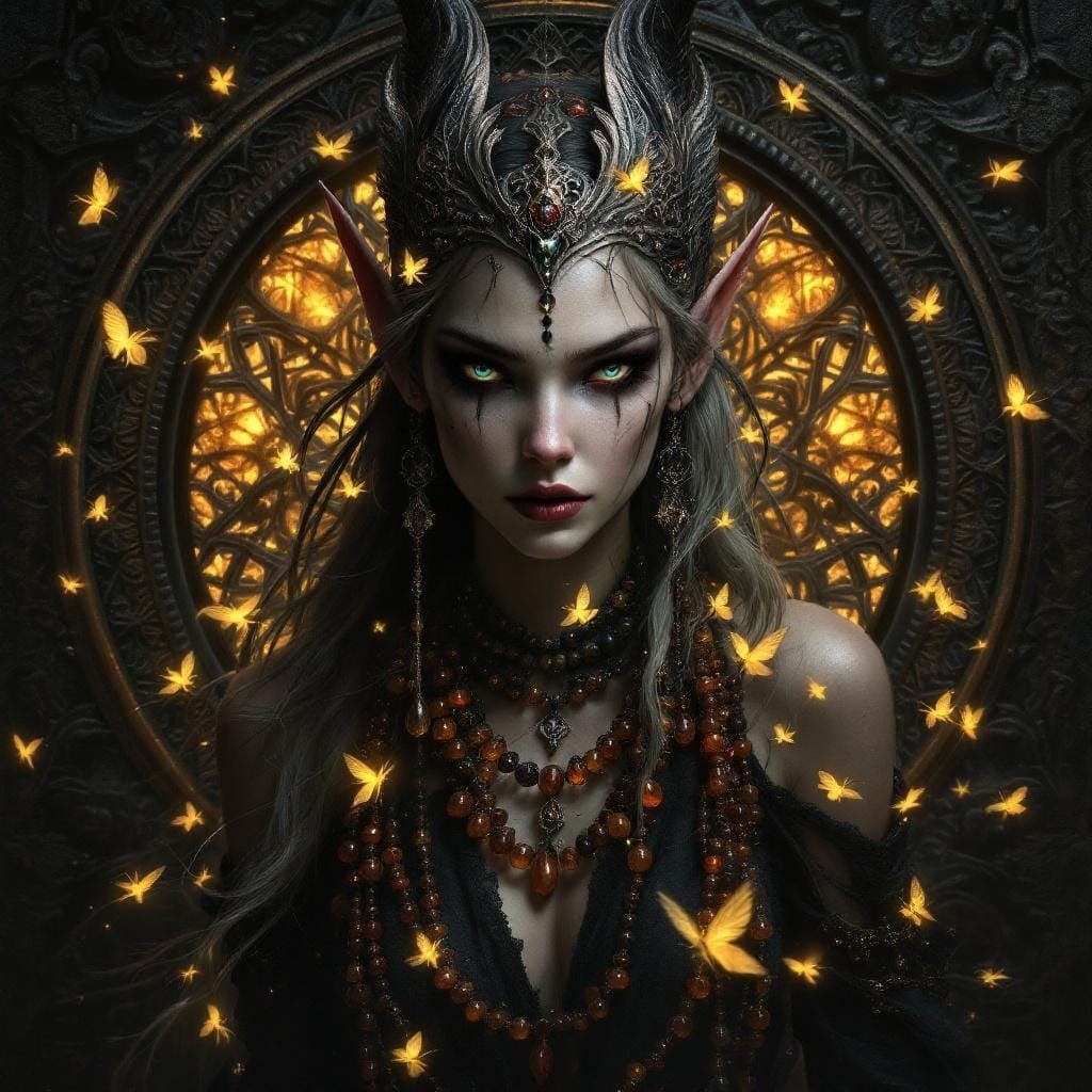 A striking picture of a sinister elven woman with long features, wearing amber and garnet beads. Fireflies surround her against a bronze carving backdrop in dark fantasy style.