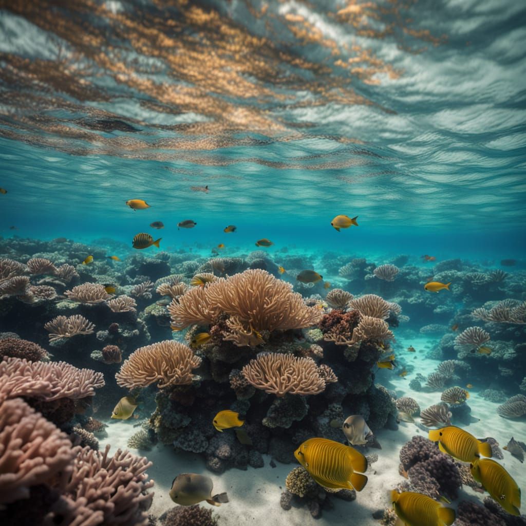 This image shows a serene underwater scene with a woman floating amidst a vibrant coral reef, surrounded by delicate fish and sea fans, in a tropical paradise with crystal-clear turquoise waters and warm golden light.