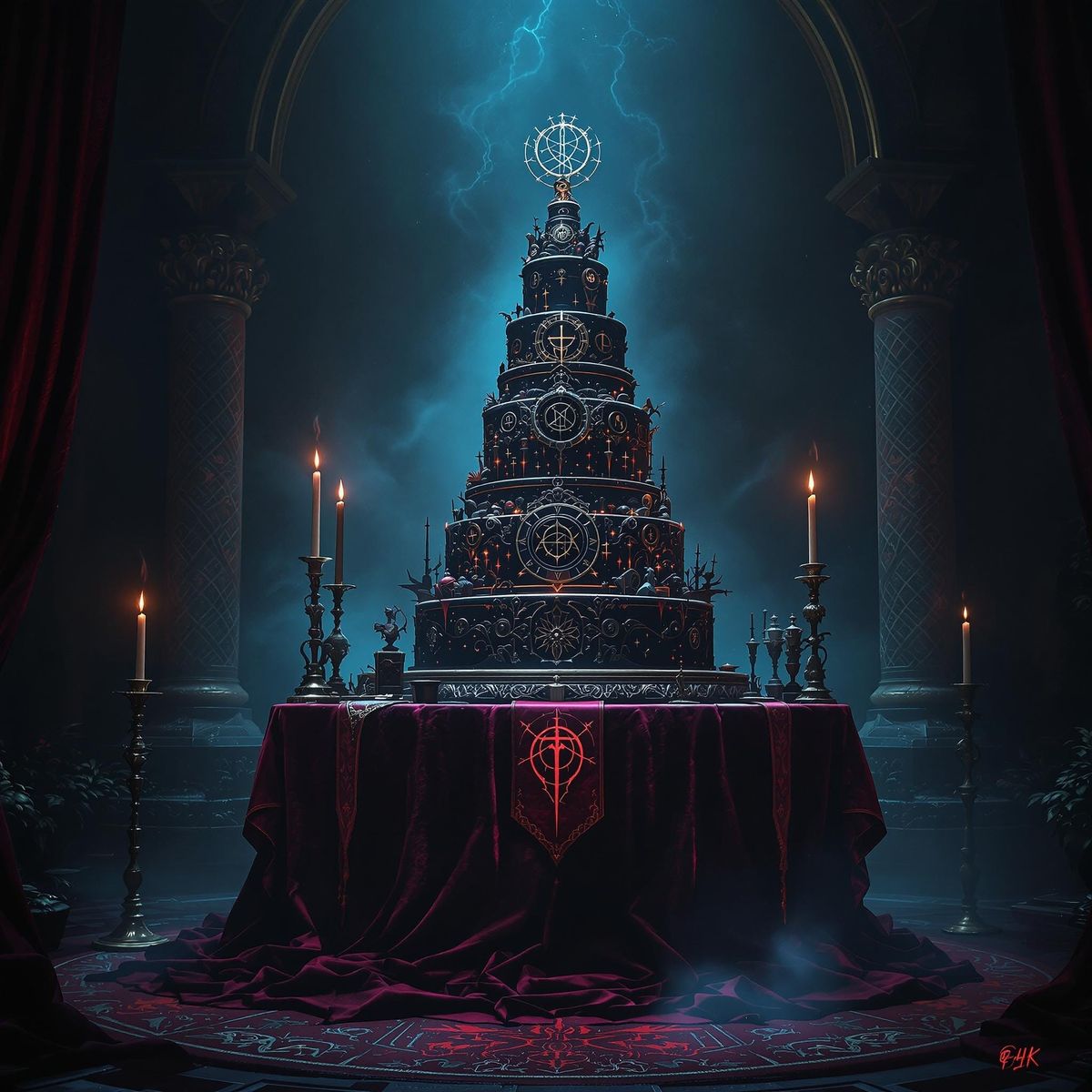 This image shows a gothic cake with mysterious symbols on a velvet altar, lit by candelabras in a dark chamber with mist. The cake is rendered as high-contrast matte painting.