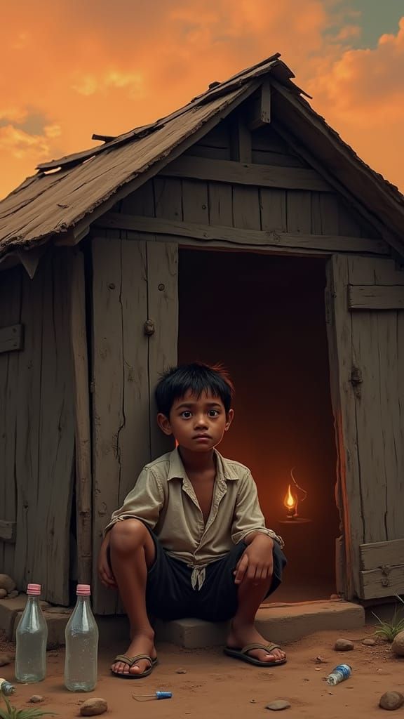 This image shows a young boy sitting outside a worn wooden hut at sunset, surrounded by a desolate yet hopeful atmosphere, created in a highly detailed, matte painting style reminiscent of fantasy concept art