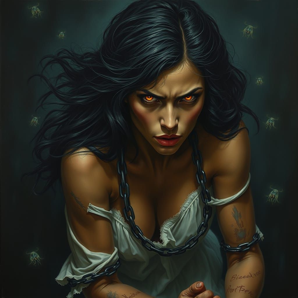 This haunting image shows a woman suspended in the dark ocean, her skin illuminated by bioluminescent sea creatures. Her long hair billows around her, and her eyes glare from a face with sunken cheeks. A tattered dress clings to her bruised body, and chains bind her arms and feet. The image is a powerful...