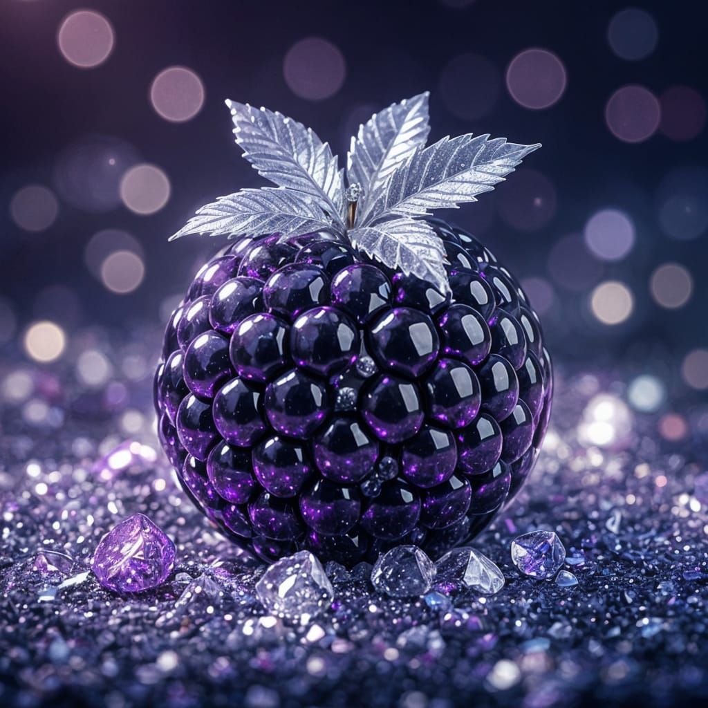 A glossy blackberry sphere glistens like polished amethyst, topped with delicate silver leaf