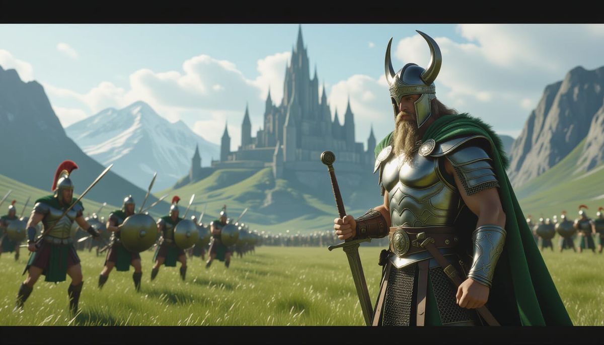 This image shows green fields in Asgard, the Realm of the Gods, where mortal warriors train. Experience the clash of swords and the distant sound of Gjallarhorn in this cinematic, ultra-detailed, photorealistic scene.