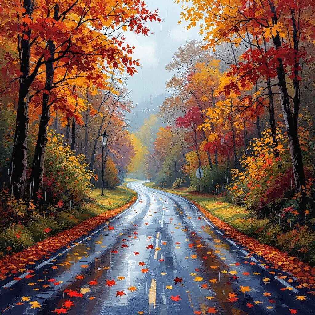 A picturesque rainy country road is depicted with vibrant autumn foliage. The scene blends impressionistic techniques with digital painting for a photorealistic, serene atmosphere.